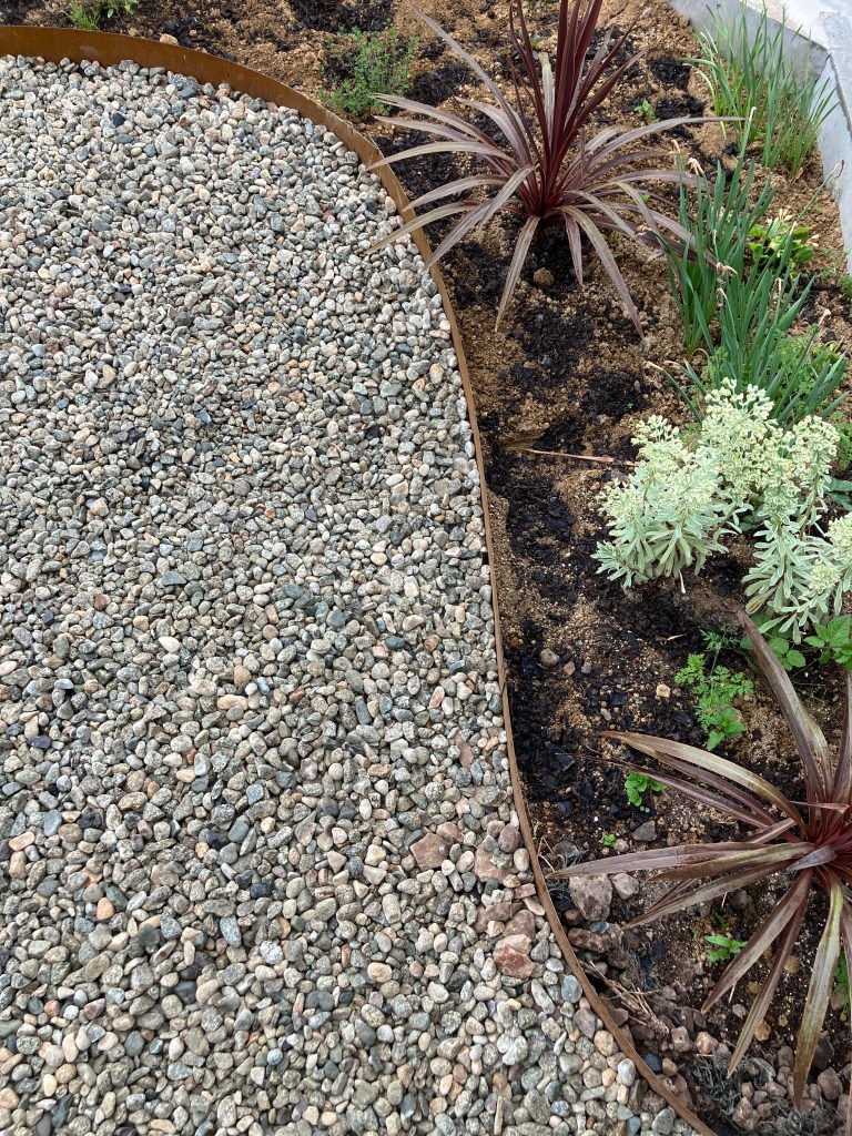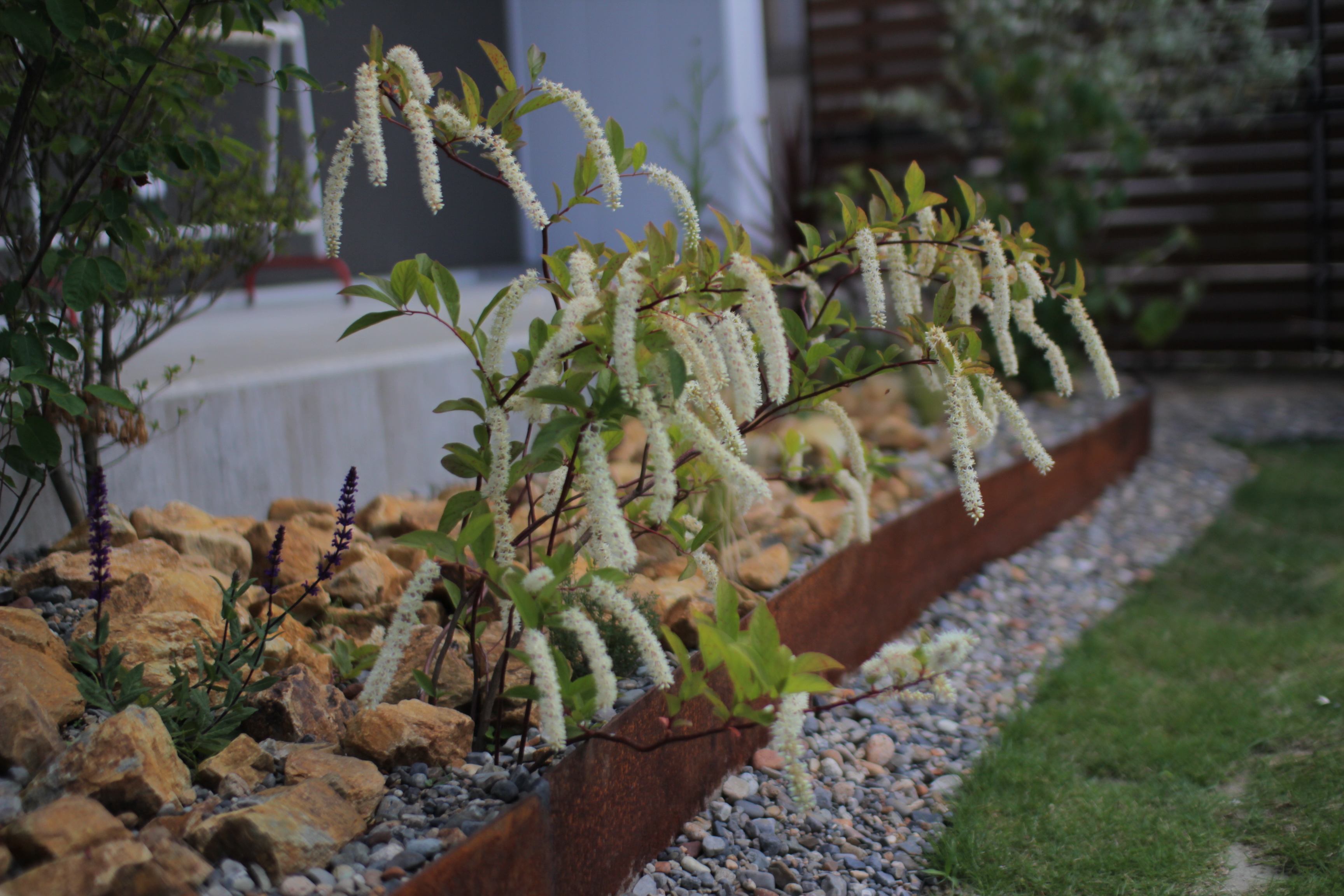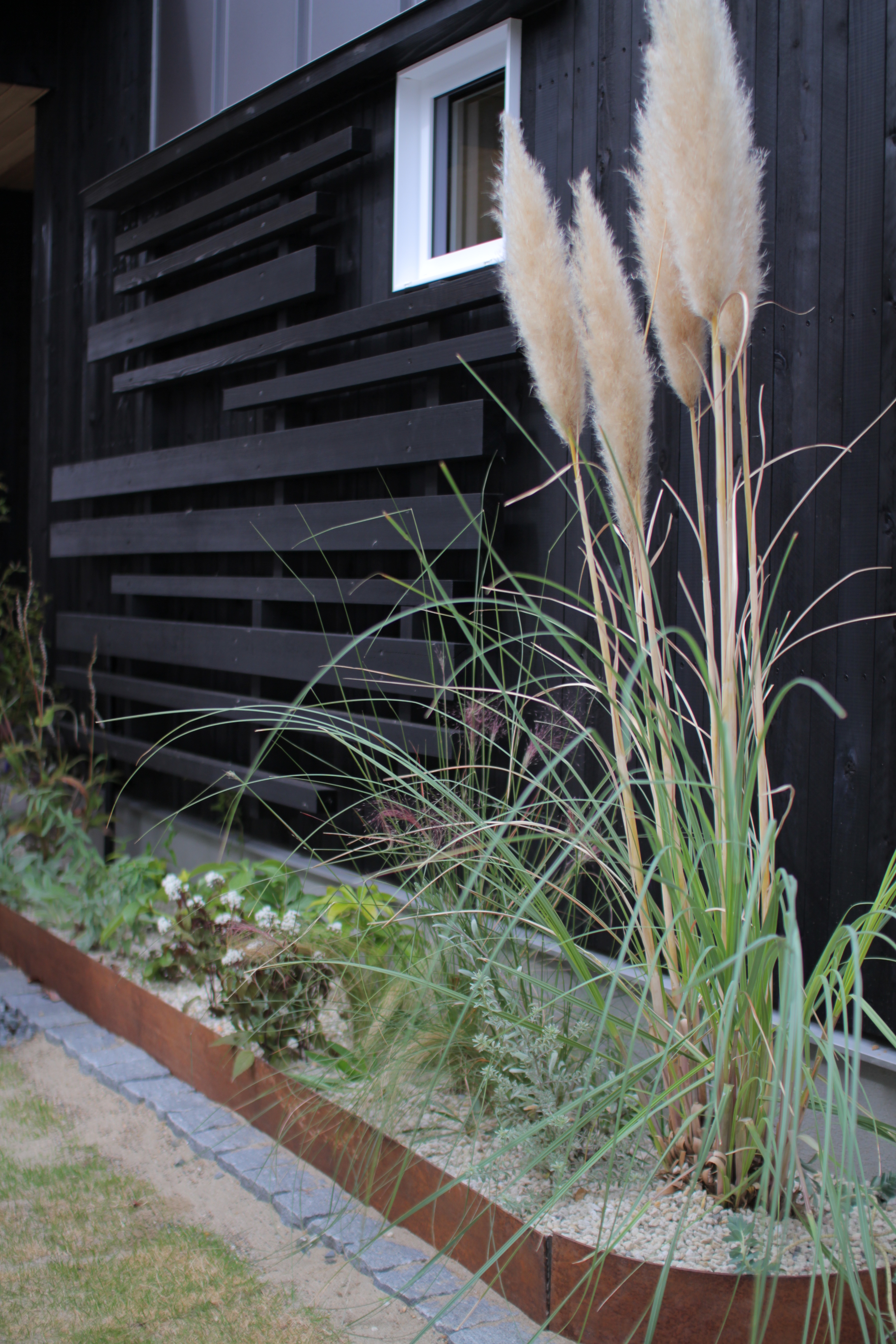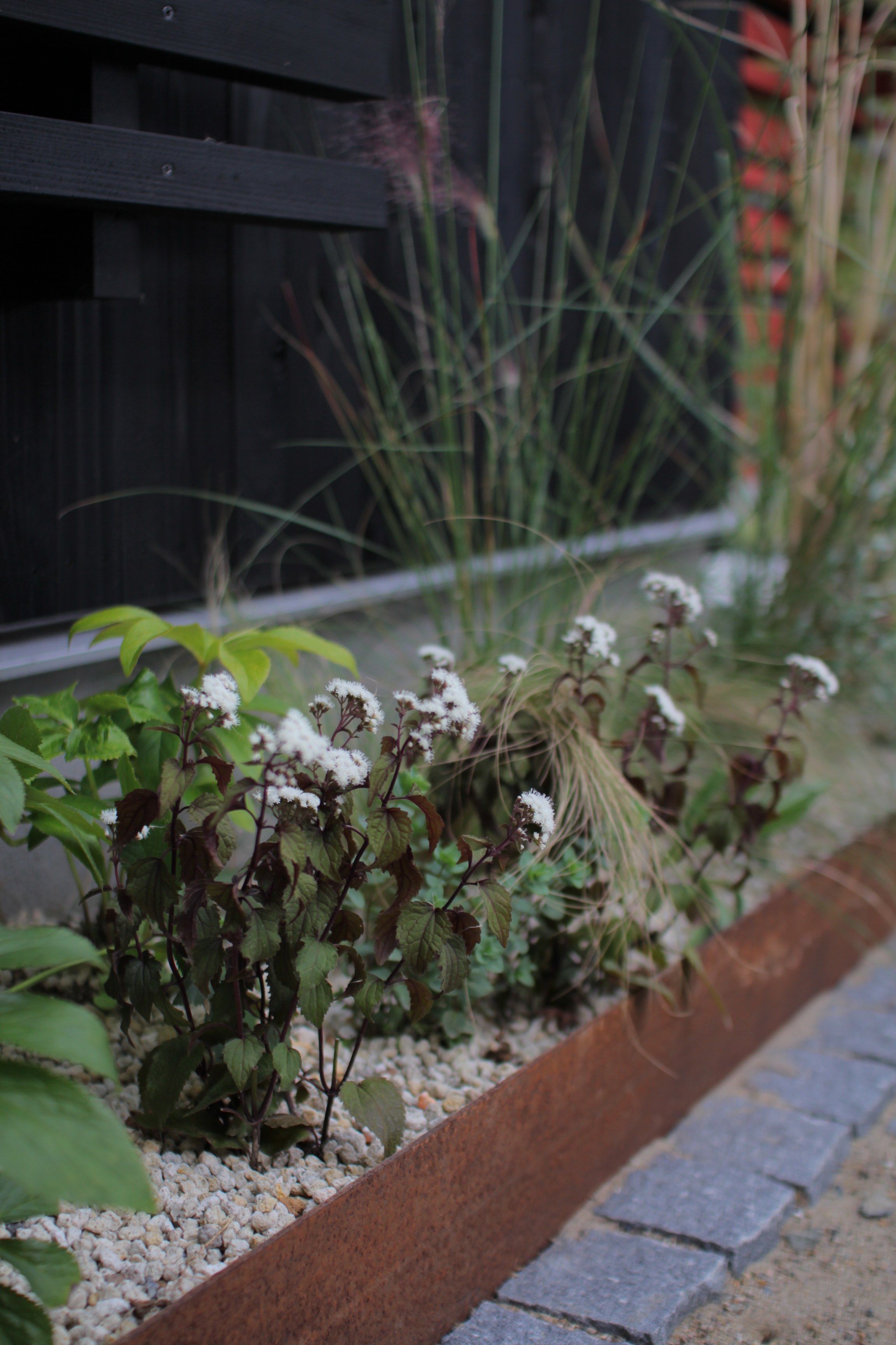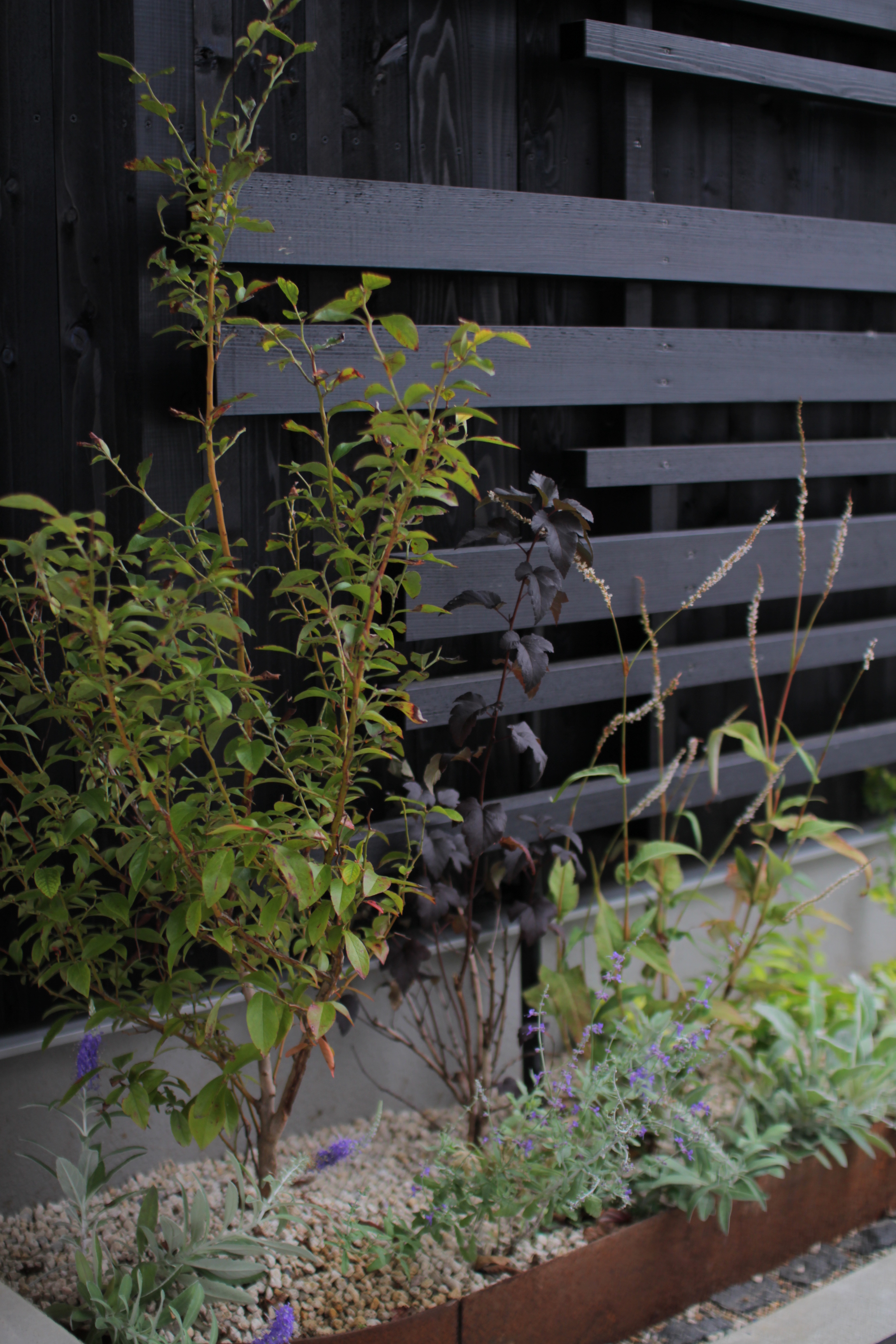 鉄とピンコロ石で熟成感のある花壇に仕上げました。