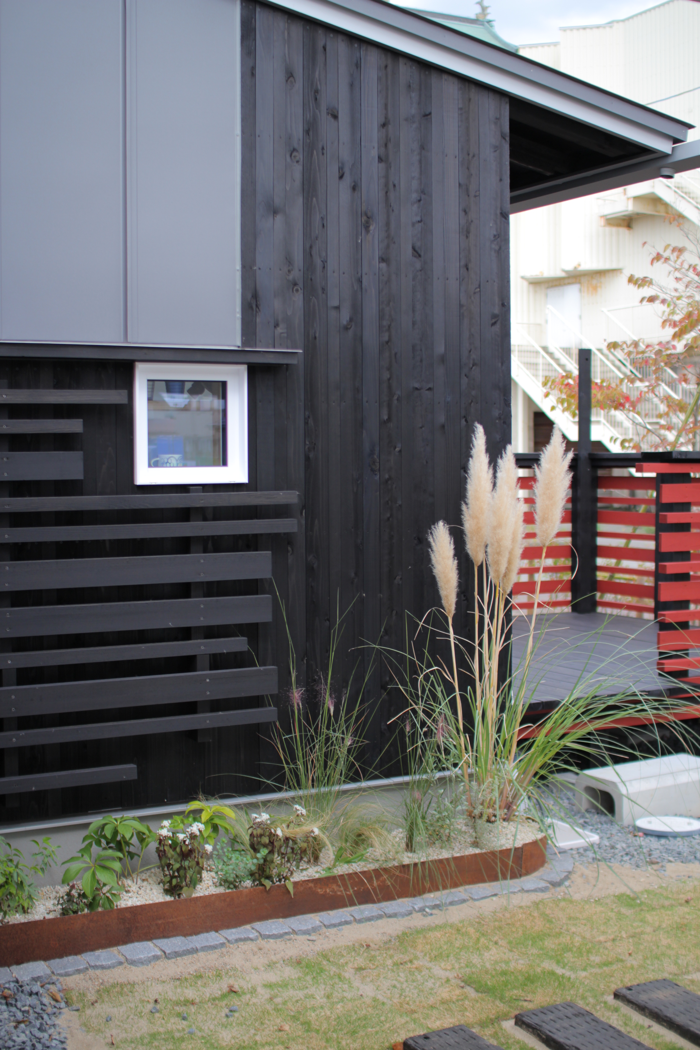 年月とともに宿根草が育って、ツタが壁に這うように設計。