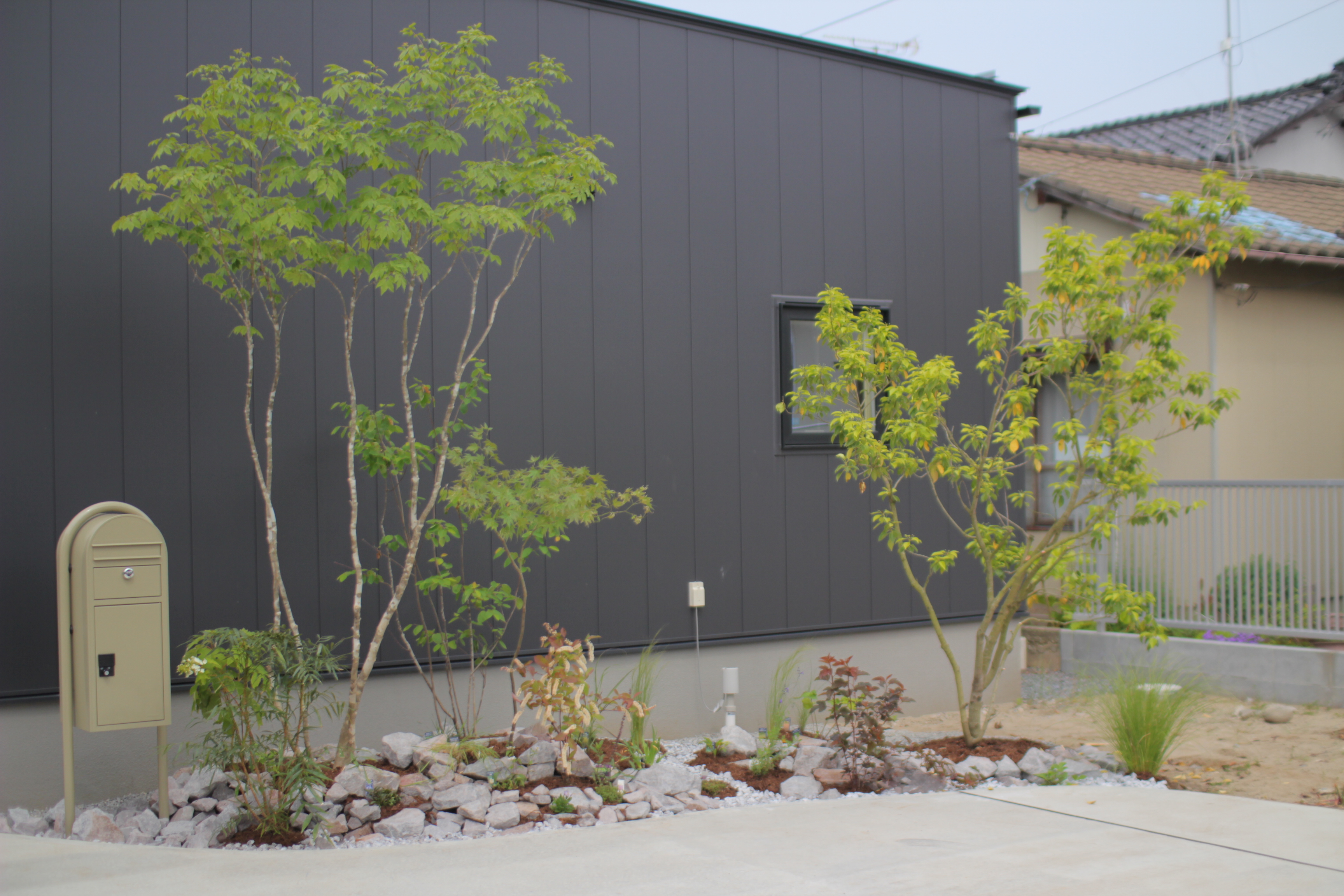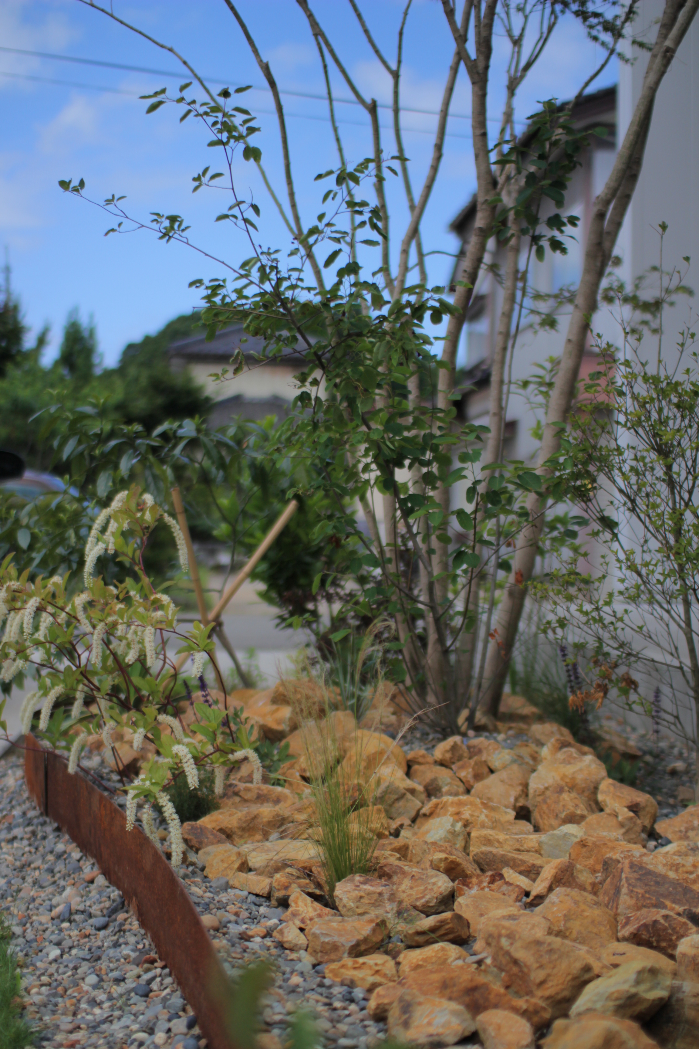 石はドライ風のイエローの花崗岩。樹木はイロハモミジにシマグミなどをミックス。