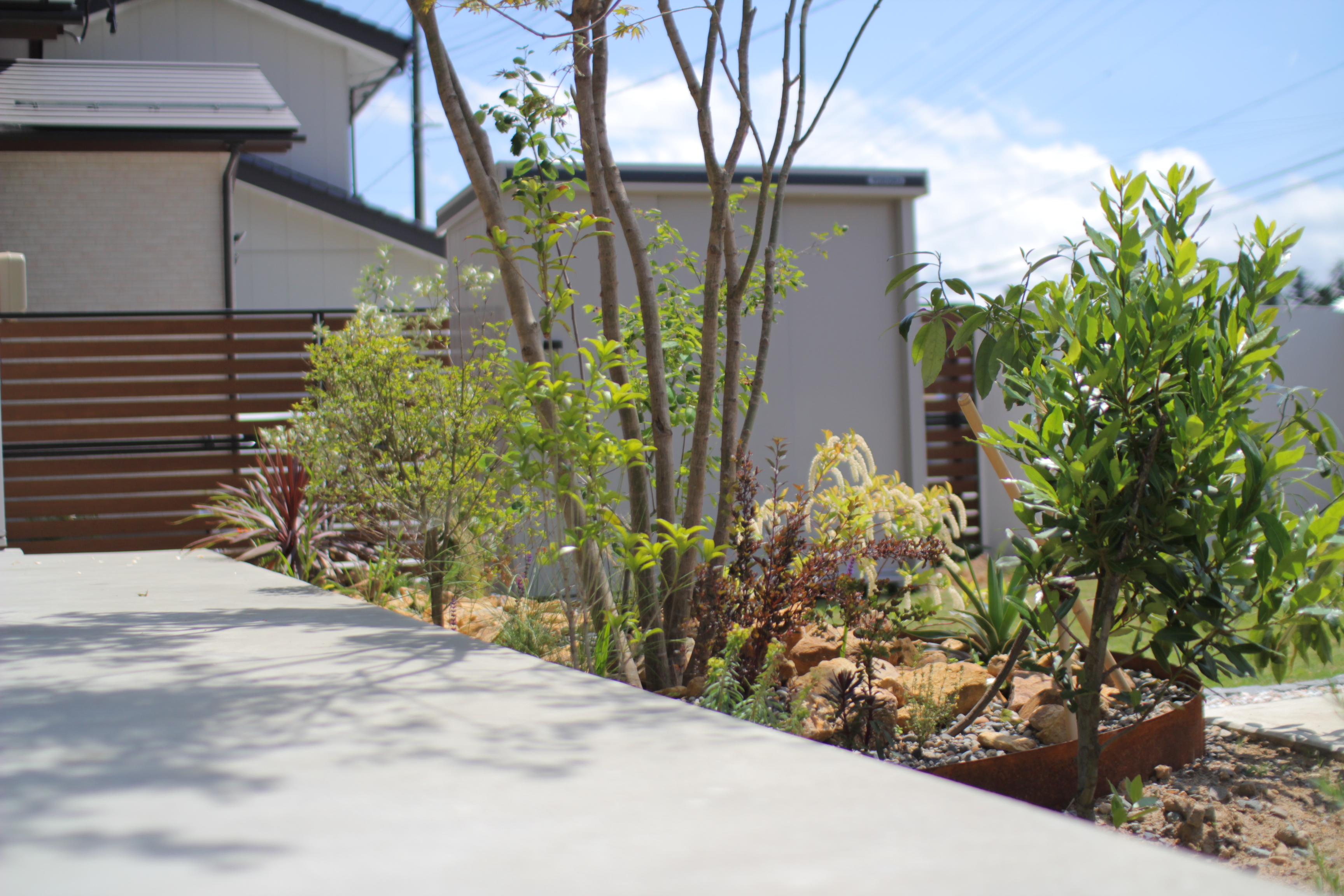 施主の希望で、多種の樹木、植栽を導入。周年で花が咲くように設計いたしました。