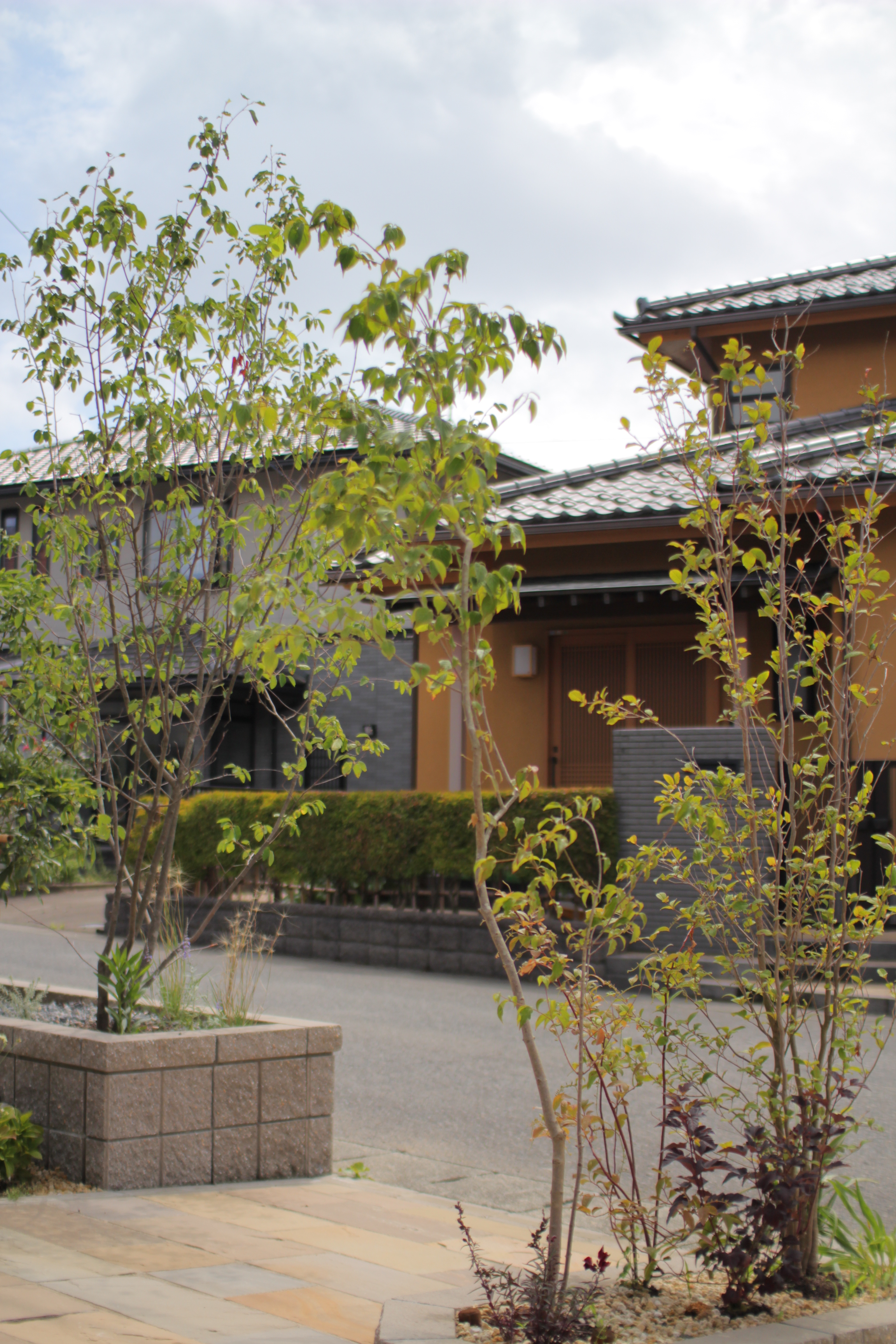 樹木による玄関アプローチの事例。花壇、生垣も配置しております。